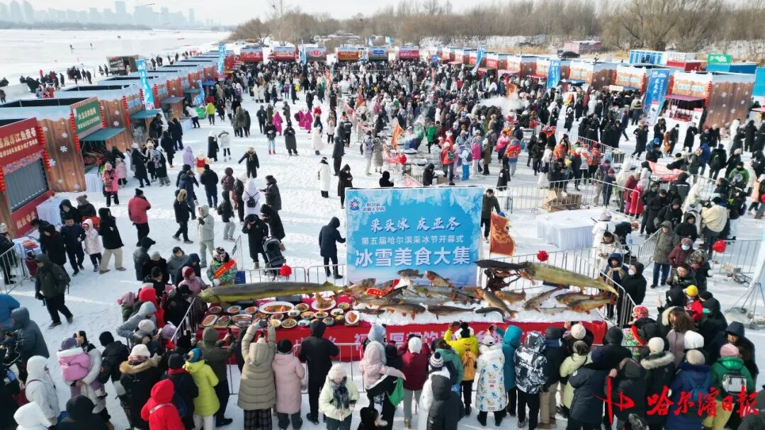 以冰雪激情奏响亚冬乐章。在采冰节现场,近6米高的雪雕“滨滨”和“妮妮”动感十足、格外吸睛,群众大联欢、幸运首日冰、大锅煮冻饺、江水炖江鱼等活动异彩纷呈,新增设的冰雪市集云集了众多文创新品、非遗精品,市民游客不仅可以在冰天雪地里品尝热气腾腾的“哈尔滨味道”,还可以近距离观赏非遗传承人的精湛技艺,并在畅玩冰雪、体验冰版画制作的过程中感受冰天雪地的独特魅力和澎湃活力。