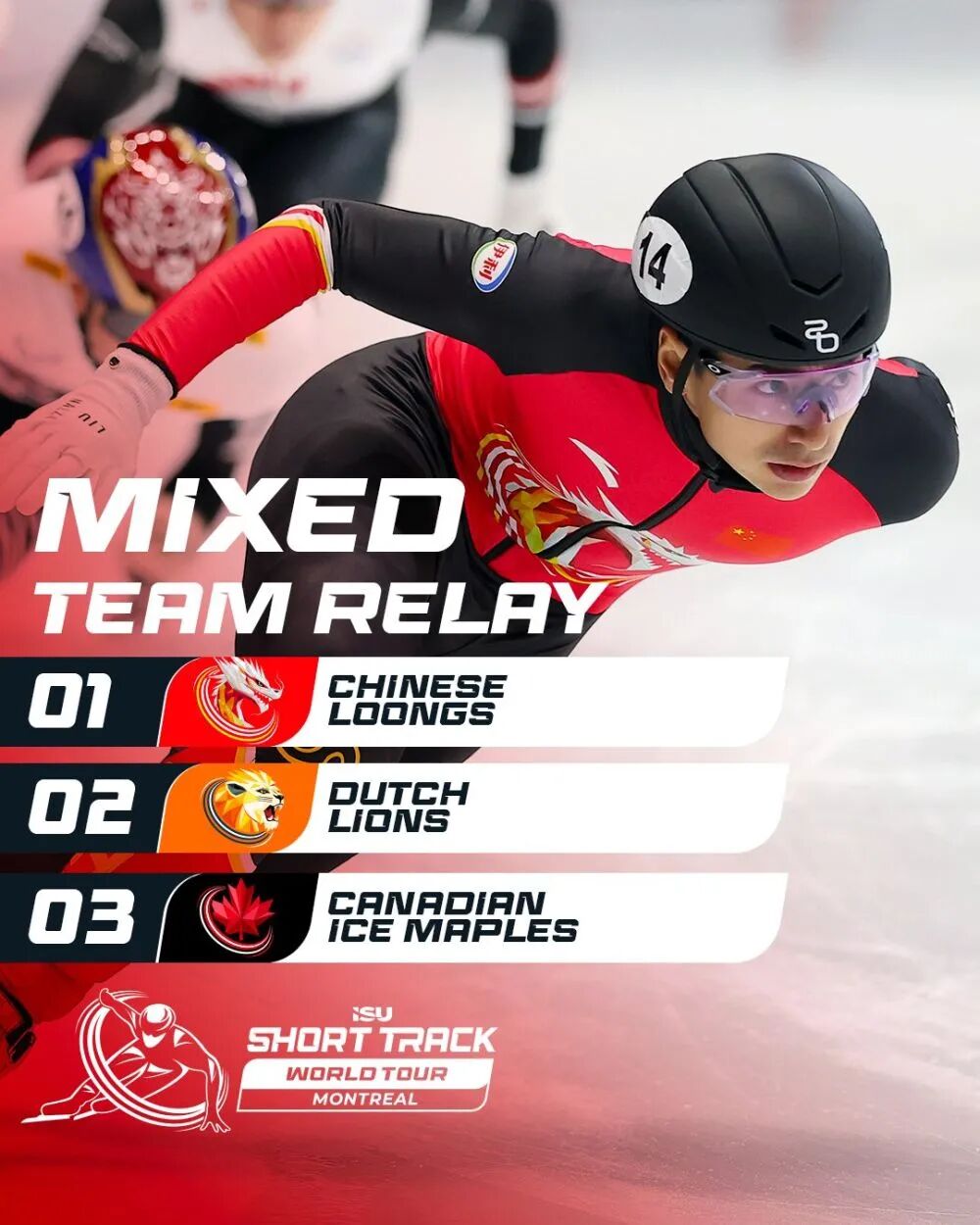 在其他项目的比赛中,中国队收获男子5000米接力银牌,刘少昂收获男子1000米铜牌,孙龙获得男子1500米铜牌。中国队最终以1金1银2铜的成绩结束了本赛季首站短道速滑世巡赛的征程。