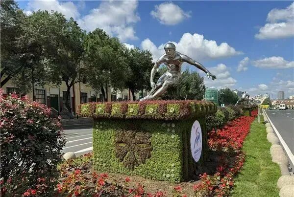 色彩温和厚重的五色草基座,与不锈钢雕塑灵动形成鲜明对比,既凸显了雕塑动态流畅的线条,又增添了景观的趣味性。基座上设置了亚冬会会徽及吉祥物图标,不仅传递了亚冬会的赛事信息,更营造出一种热情洋溢、宾至如归的迎宾氛围。五色草的植入则为这组雕塑增添了一抹自然、绿色的生机与活力,使得整个景观更加和谐统一,富有层次感。