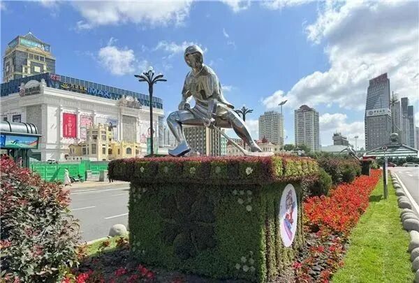 据悉,南岗区园林局在红军街分车带内打造的运动雕塑景观,融合了五色草的生态韵味与不锈钢雕塑的现代质感,编织出一幅“激情冰雪,相约亚冬”的冰雪运动画卷。
