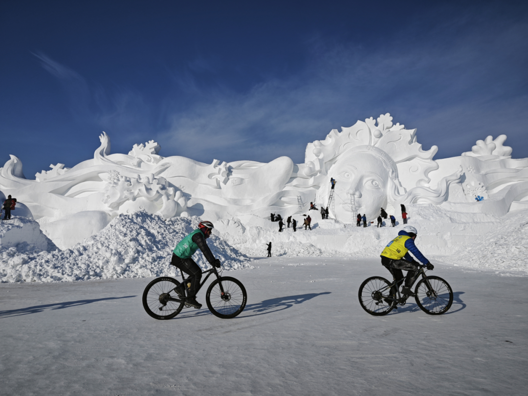 穿越冷风,雪地畅行,2023年12月24日,参加“2023上海合作组织雪地自行车赛”的近千名自行车运动员,从第36届太阳岛雪博会主塑“雪绒花”前骑行而过,在绝美雪景中享受冬季运动带来的愉悦与挑战。