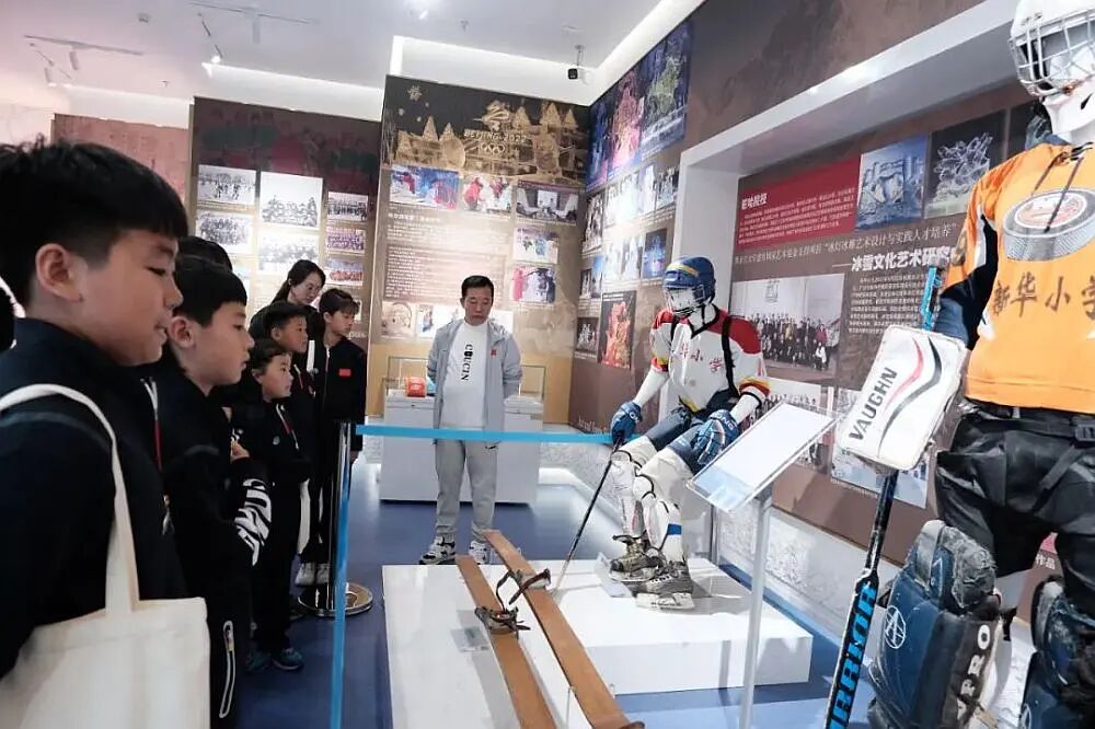 金鹰冰球俱乐部的刘万富老师指着这里陈列的新华小学老运动员穿过的球衣、冰刀、护具,对小冰球运动员们说:“你们看,当年这些大哥哥大姐姐,就是穿着这样简陋、破旧的衣服和冰刀,取得了全国青少年比赛的冠军。你们现在的装备、条件比他们好多了,要珍惜前辈们取得的荣誉,继续刻苦训练,为祖国争光,向哥哥姐姐们一样取得好成绩!长大后,希望你们的照片也可以在冰雪博物馆展出。”