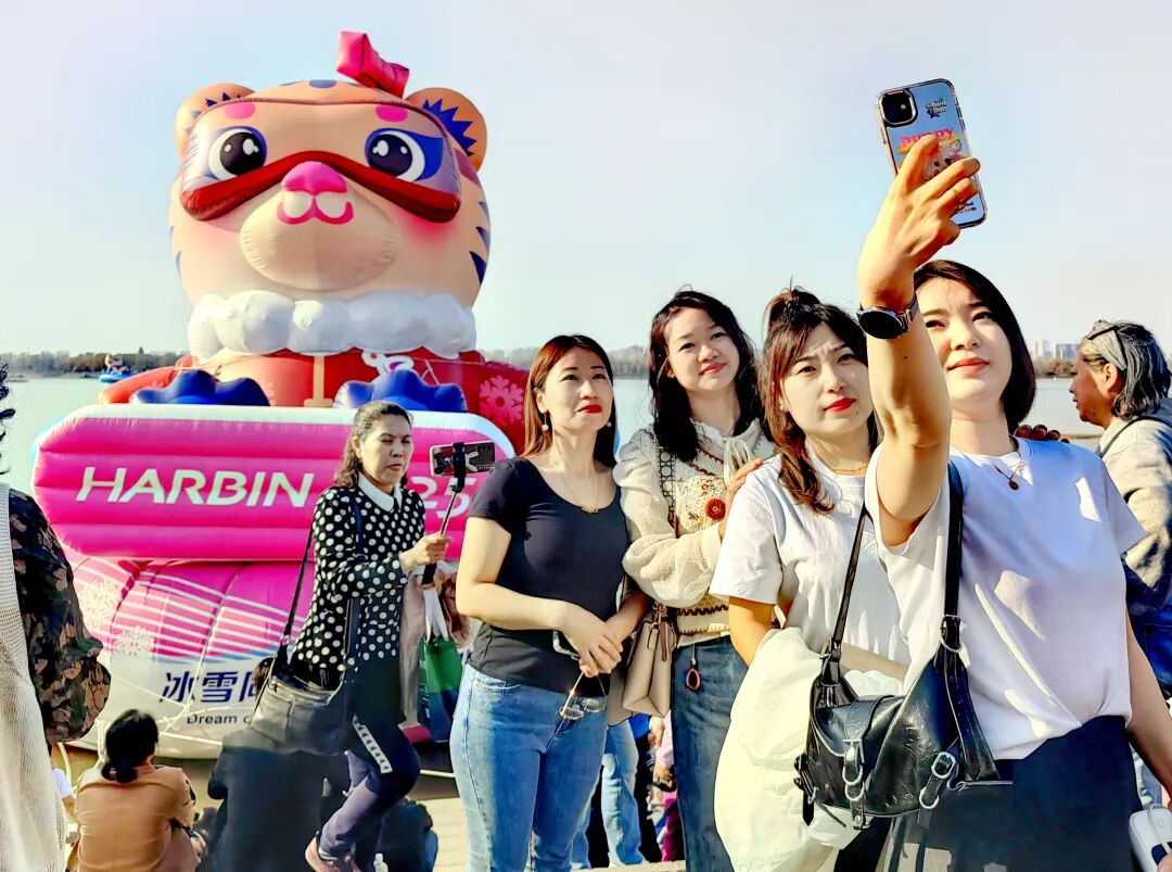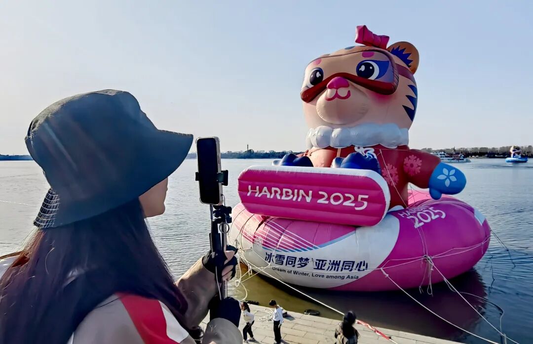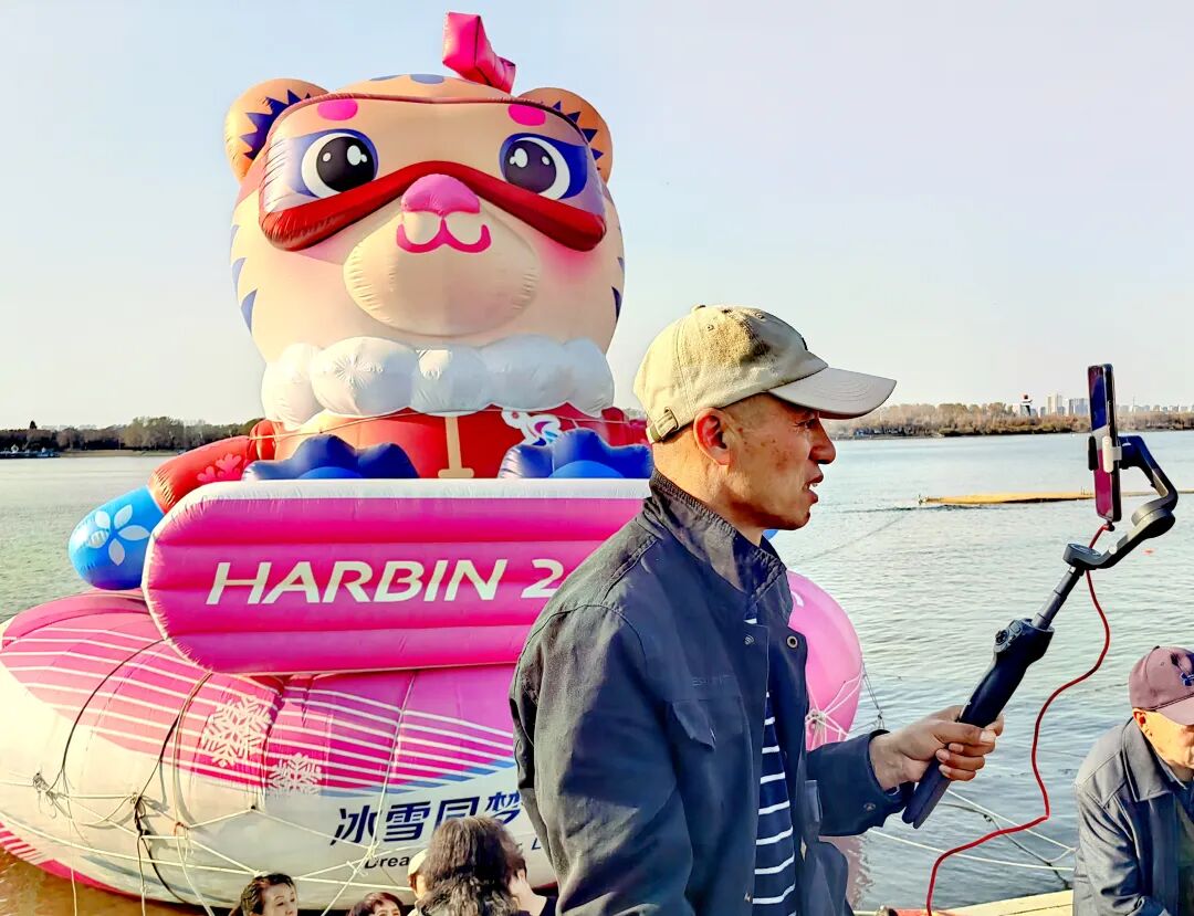 17日,哈尔滨天空晴朗,许多市民和游客来到松花江边,观看或拍摄巨型亚冬会吉祥物“滨滨”“妮妮”。一些网络主播也来到这里进行现场直播,让网友通过网络看到“滨滨”“妮妮”,让更多的人了解亚冬会。