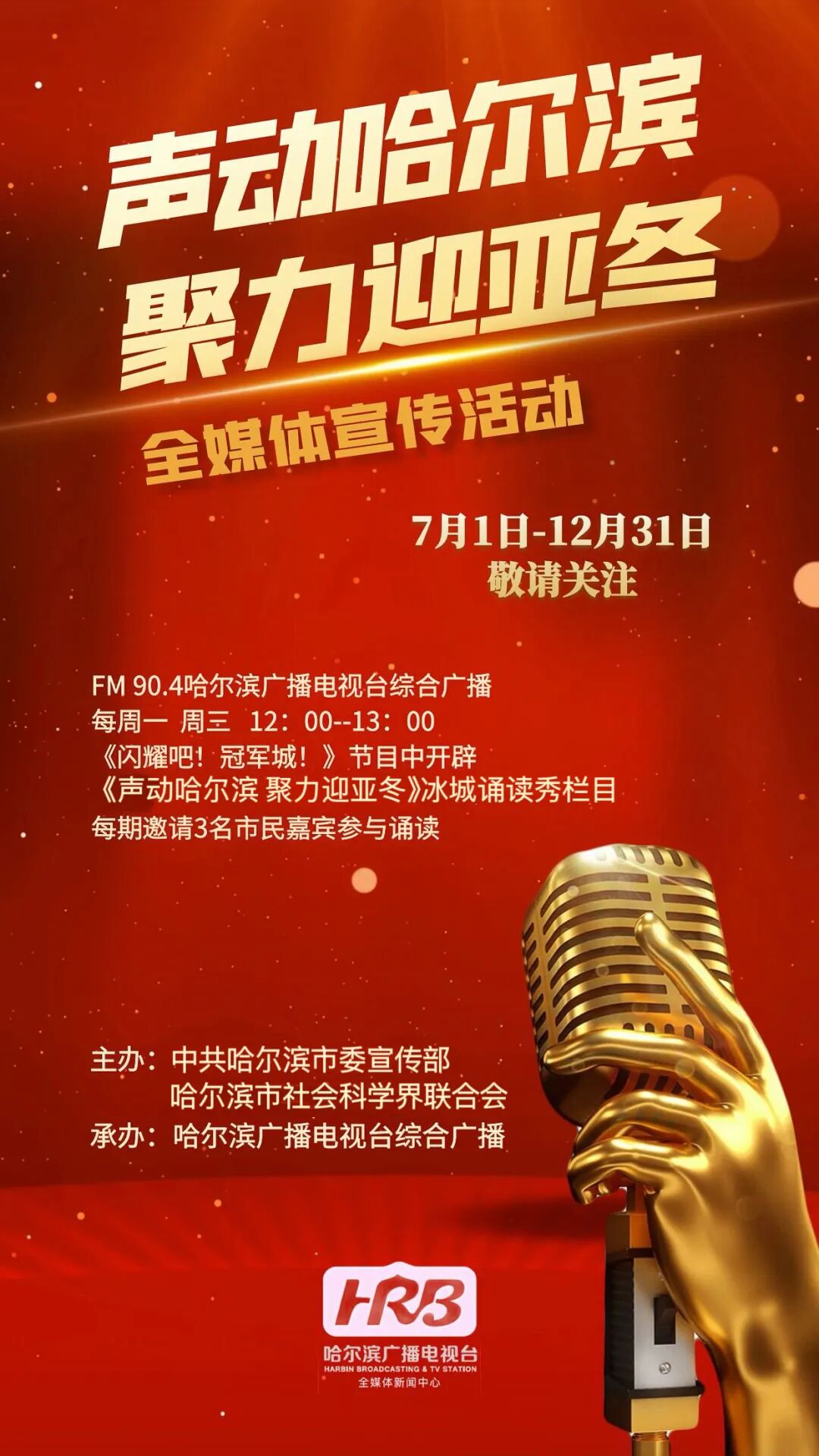 FM90.4哈尔滨广播电视台综合广播每周一、周三,中午12:00--13:00《闪耀吧!冠军城!》节目,开辟《声动哈尔滨 聚力迎亚冬》冰城诵读秀栏目,节目将历时6个月,由六大板块组成,每月一个主题,分别开设红色印迹篇、多元文化篇、城市建设篇、生态宜居篇、四季旅游篇和冰雪体育篇,由主持人和朗读者共同完成。期间,将选择优秀朗读作品制作短视频,在“哈尔滨综合广播”视频号、“哈尔滨新闻广播官方账号”抖音号、冰城新闻、“哈尔滨社科联”官网、“哈视界”微信公众号上进行展播。