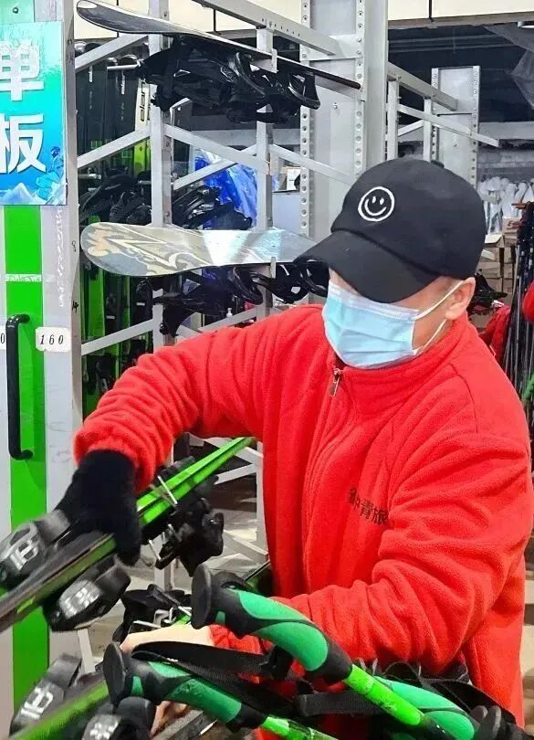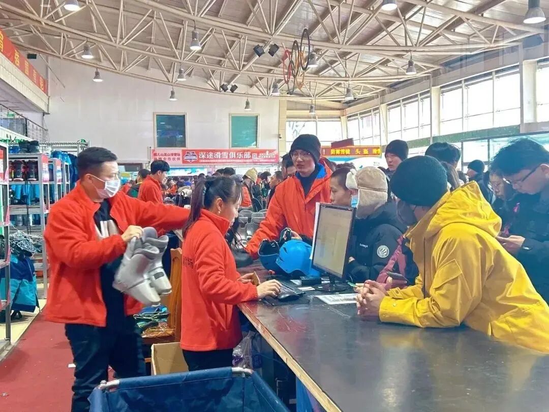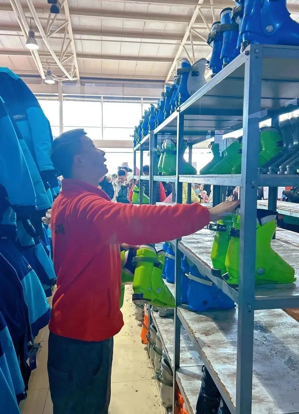 在雪具大厅,有工作人员引导游客购买雪卡,而后前往雪具领取处。根据客人的身高、鞋号为游客提供所需滑雪板和滑雪鞋。
