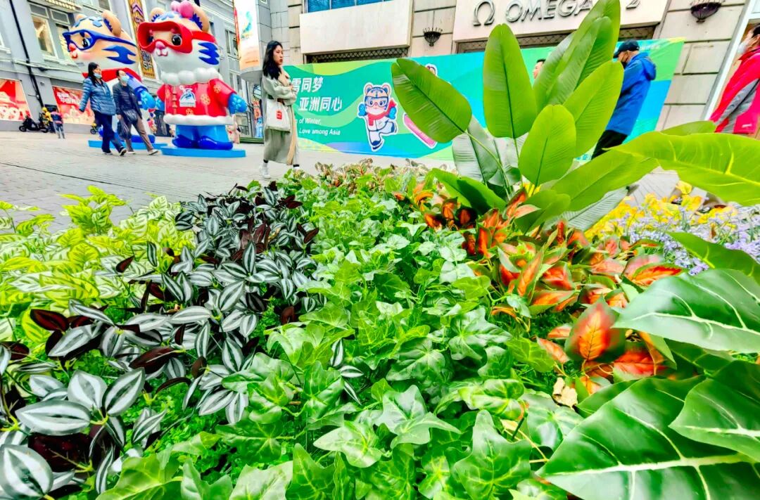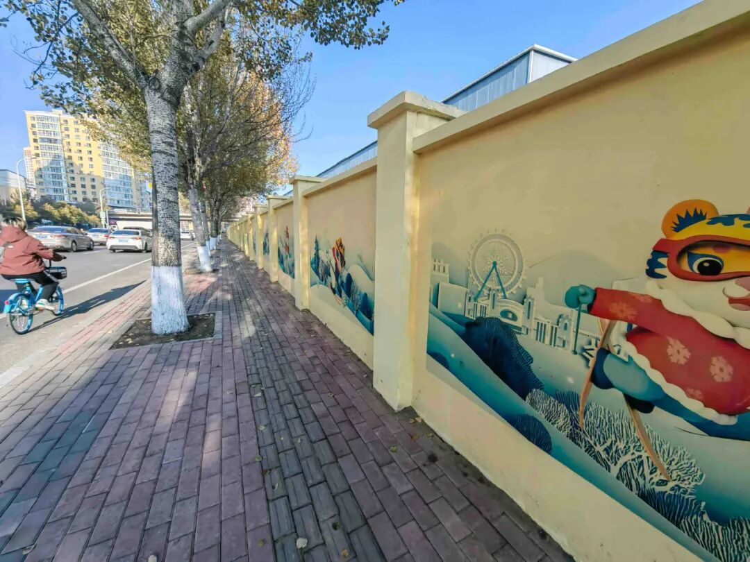 和兴路上,爬山虎爬满了隔离带的铁栅栏,仿佛一面艺术感十足的绿色镂空墙,这是街头垂直绿化的效果。如今,哈市一些立交桥墙体、街头栅栏等都实施了垂直绿化,让城市绿化空间得以拓展且更有层次感。“为完善道路绿化景观的连续性,哈市在重要街路、区域、节点栽植常绿树,提高冬景‘含绿量’,努力让哈尔滨的冬天绿意更浓。同时增加冬季观果、观彩枝、观赏草等植物,营造冬季植被特色景观。”哈尔滨市城管局园林中心相关负责人说。今年,哈市以亚冬会品质提升园林绿化项目为重点,持续推进“增绿添园”和植树造林工程,在市区115个节点进行园林绿化提档升级。项目以亚冬会景观氛围营造为特色,在重要街路、区域、节点以五色草、景观小品、艺术造型等形式融入运动元素,体现哈尔滨冰雪文化特色。同时,全市通过新建和原有绿地升级改造等方式,新建、改建口袋公园60个,让市民在家门口享受“绿色福利”,为市民提供更多休闲娱乐的好去处。老楼粉刷旧貌换新颜建筑外立面是城市街景的重要组成部分,是市容市貌和建筑文化的显性表现。今年以来,哈尔滨市对亚冬会保障街路老城区部分主要干道沿街建筑外立面进行升级改造,以“小切口”推动城市环境质量“大提升”,助力文明城市建设。