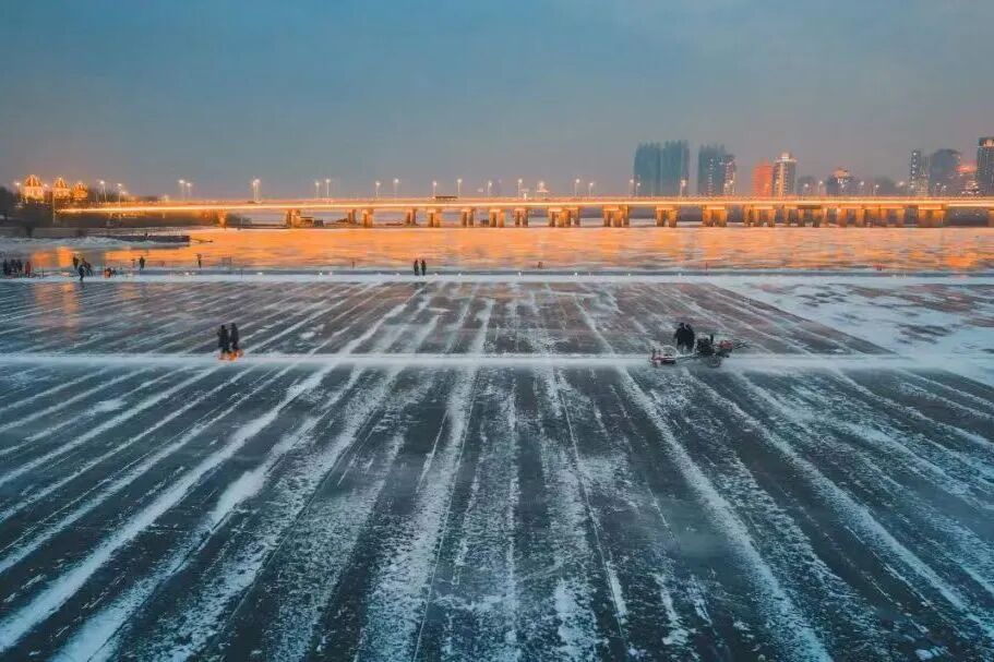 选好了最优质的江段之后,就进入到了清雪理冰阶段。工作人员要将冰面上的积雪和杂冰进行清理、打磨,保证冰面的光滑和平整。