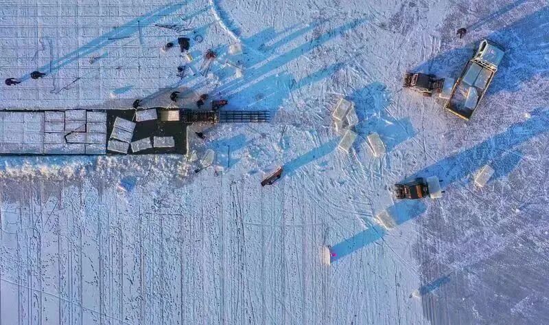 想让冰塑景观呈现出晶莹剔透的效果,就得选择松花江水流最缓、水质最清、冰层透明度最高的江段进行采冰。