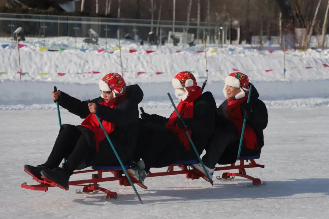 蓝天白雪映衬下,300余名残疾人朋友及其亲友走出家门,赏冰乐雪,尽情嬉戏。他们积极参与冰爬犁、雪地鞋跑、软式曲棍球、雪地足球、雪地毽子、雪地拔河、冰上自行车、雪地转转等冰雪运动项目,充分享受冰雪运动的乐趣,展示自强不息、追求美好生活的精神风貌。