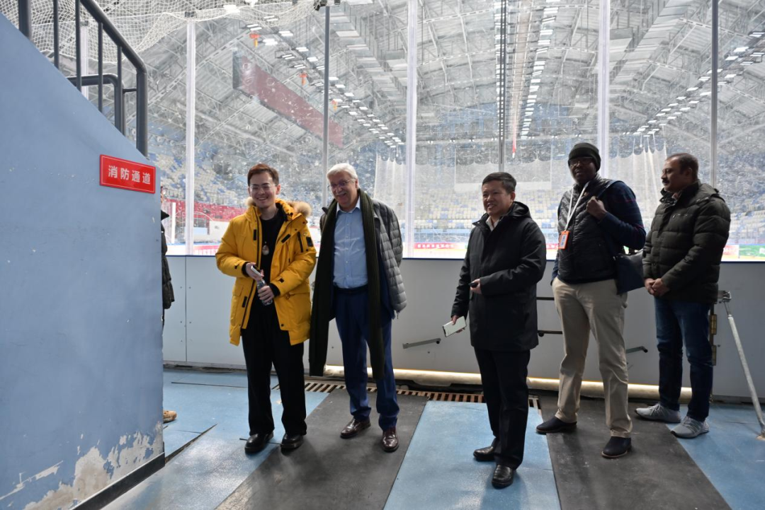 3月7日下午,穆巴拉克一行实地踏勘了哈尔滨冰球馆、亚冬会媒体中心,参观了冰球比赛场地,运动员、VIP休息室、MMC和ITCC指挥大厅等信息技术相关区域,并对场馆功能用房、转播用房等情况进行考察。